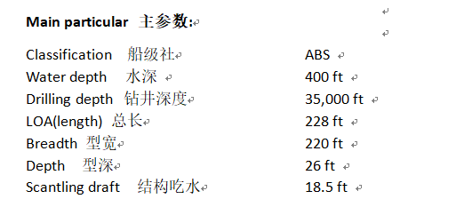 Active heave compensator(主动补偿): 907 mt static, 680 mt passive compensation, 25 feet 25 mt active