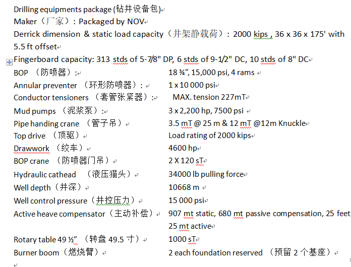 Derrick dimension & static load capacity(井架静载荷): 2000 kips , 36 x 36 x 175' with 5.5 ft offset