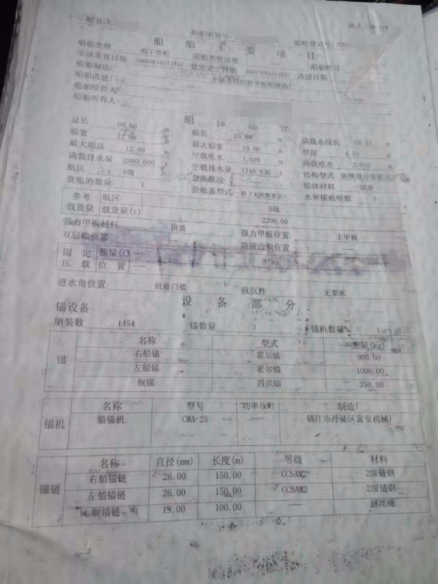 出售2950吨干货船: 船长69.6宽12.9型深4.7米,开船动力淄博6170型480马力x2台