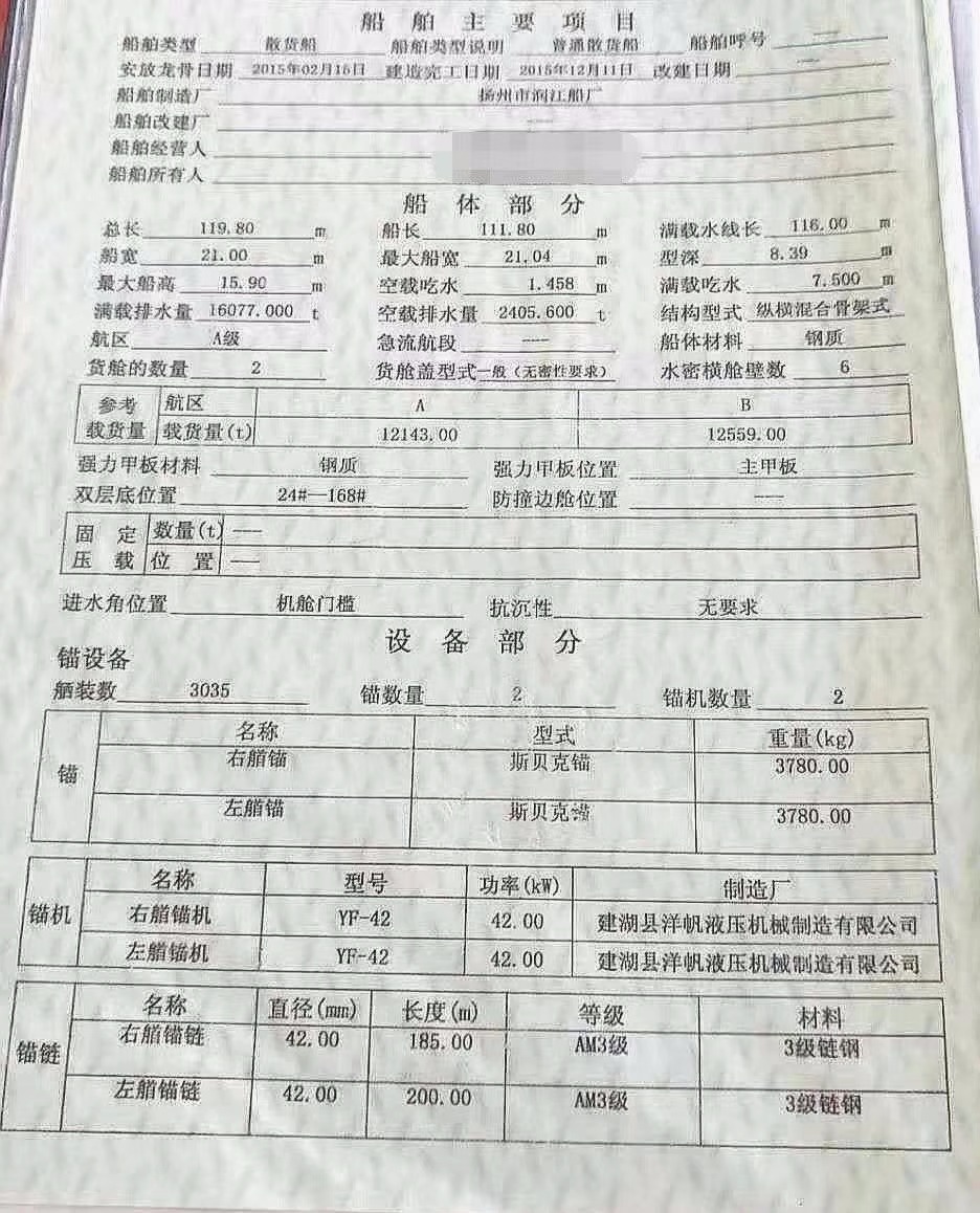 三楼/鹅头/带侧推380马力,龙筋11道,二层板15个.内站板12个.甲板22个.顶力板20个.外挂12-10个,没有下过海《总吨6338.净吨3549》挂户安徽.