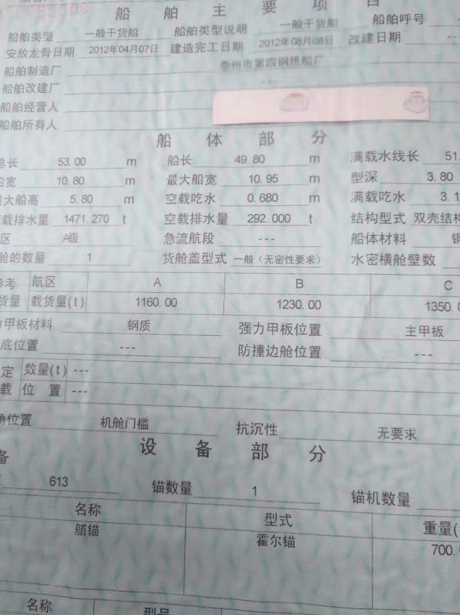 吉船:53X10.8(总宽10.95)X3.8,尖头前驾,油压,马力两台300潍柴,泰州四钢船厂,2012年8月,底龙15道,50十10公分条,边筋30下料,全强,挂板8,底板,水板10个,大川,甲板10个,总吨625吨,大仓32.5米,手续,泰州,考虑的朋友微我